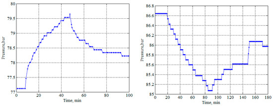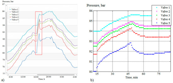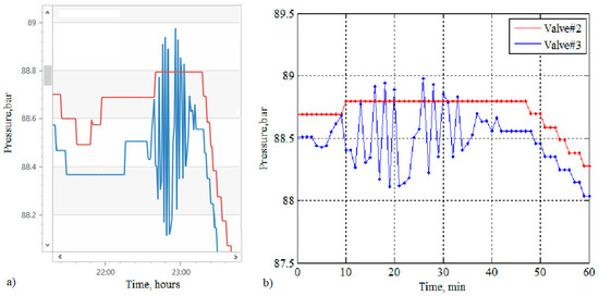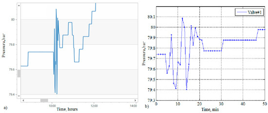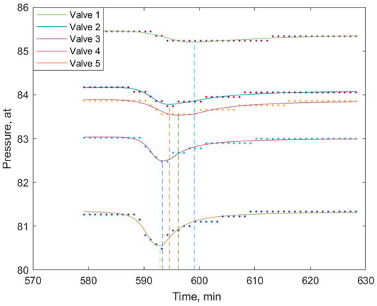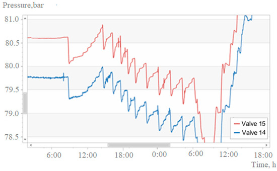 Figure 8 shows a wave process that lasted about 16 h. During this time, nine cycles took place, of which the duration of each was approximately 108 min. Each cycle began with a sharp drop in pressure, followed by a relatively slower rise. A downward trend of about 1 bar in nine cycles was superimposed on the cyclic change in pressure. It is possible that the waves were initiated by the equipment switching at CP 1. The starting point of the process was a sharp decrease in pressure (by about 0.6 bar) after a stable regime. The oscillatory process ended with a significant (for valve 1, more than 2 bar) pressure drop. The time interval from the start to the moment of passage of the pressure minimum was approximately equal to 1 day.