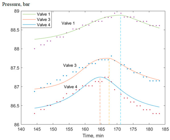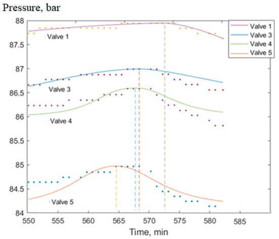 Figure 4 clearly shows that when moving from the lower curve to the upper one, the maximum “blurs out”, that is, the error variance increases; moreover, even for the lowest curve (pressure measurements of valve 5) the moment of passage of the peak has significant uncertainty. Therefore, quite often, it is not possible to determine the moments of time