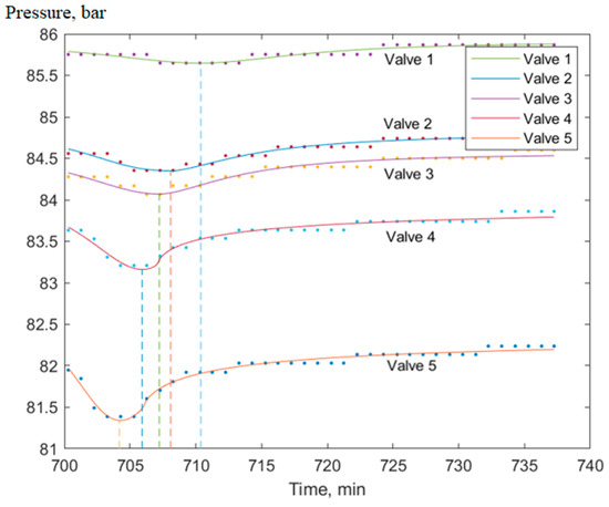 Figure 5). For some cases, it is possible to compare the speed estimates from the SCADA information and approximation, as their closeness is evidence of the acceptable quality of the estimates. If the estimates are far from each other, then the estimate should be taken according to time and corresponding to the SCADA maximum pressure measurements, and the approximation should be considered unsatisfactory (the SCADA information for each valve is represented by dots in
