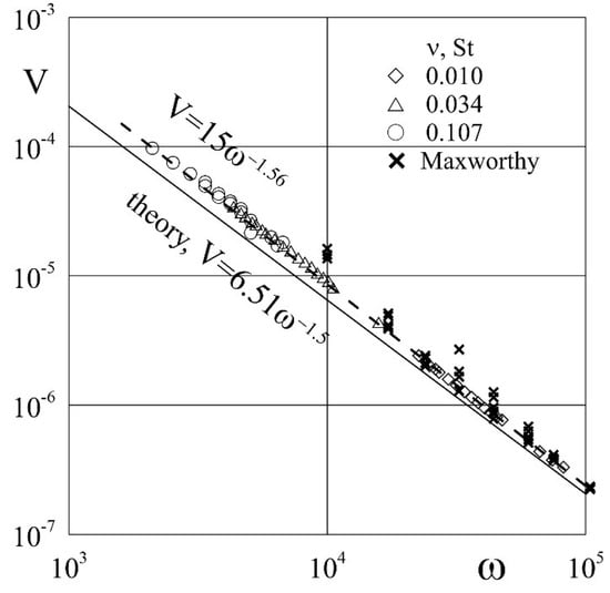 As can be seen from Figure 8, all the experimental results obtained on liquids of different viscosities, with a variation in the rotation velocity over a wide range, are in good agreement with each other on the plane and can be approximated by a single law . The value of the Rossby number, , corresponding to the experimental points in Figure 8, could be estimated according to the formula , in the experiments it varies in the range . With regards to the Reynolds number, , in our experiments its value is relatively small, .