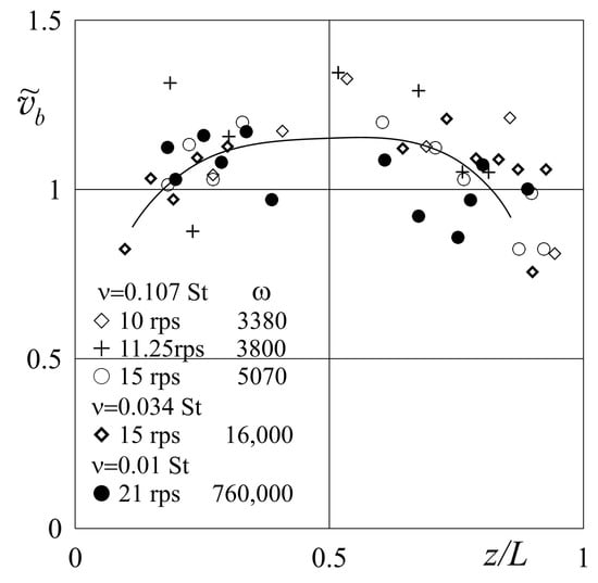 From Figure 3, it follows that the velocity of the body ascent slightly and decreases near the ends of the cavity. At the same time, the dependences of the velocity on the coordinate obtained in liquids of different viscosities at different rotation velocities in Figure 3 have a similar form, although they differ significantly in magnitude. Let us use the dimensionless velocity , where the unit of measurement is the experimental mean velocity of the body (taking into account the dimensionless rotation velocity). This allows one to compare the results of measurements with different values of the dimensionless velocity of rotation (Figure 9). As can be seen, the velocity distributions of the body along the length of the cavity at different values of the dimensionless rotation velocity are in satisfactory agreement with each other. This means that in the entire studied range of parameters, the longitudinal motion of the body obeys one law, and its intensity is determined by a single dimensionless parameter—the dimensionless velocity of the cavity rotation. At the same time, the velocity of the body remains almost constant along the entire length of the cavity.