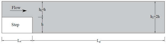 In Part 1, for validation, we consider a two-dimensional, classically backward-facing step flow, namely BFSF 1. The geometry was considered by following the geometry experimentally studied by Armaly et al. [3] and Wang et al. [1] with an expansion ratio (ER = h2/h1 = 2). The computational domain of the present study consists of a total longitudinal length of 56h (Lu = 6h, Ld = 50h, and Lu and Ld are, respectively, the length upstream and downstream of the step). Based on Biswas et al. [10], a distance of five times the channel height upstream of the step (Lu ≥ 5h1, h1 = h) was verified to be sufficient. At the outlet of the computational domain, the flow was fully developed. The sketch of the BFSF is presented in Figure 2.