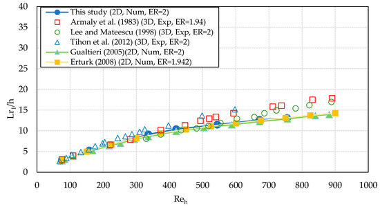 Dimensionless primary reattachment length Lr1/h vs. Reh in laminar flow (Exp, experimental study; Num, numerical study; 2D, two-dimensional; 3D, three-dimensional; ER, expansion ratio) [3,14,19,23,25].