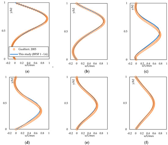 Dimensionless u-velocity profiles (u/Umax) at Reh = 672. (a) x/h = 5, (b) x/h = 7.5, (c) x/h = 12, (d) x/h = 15, (e) x/h = 22.5, (f) x/h = 30 [23].