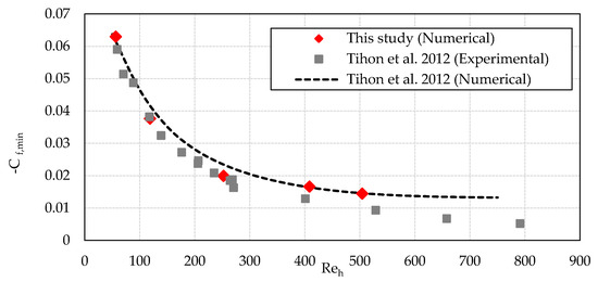 The distribution of the skin friction coefficient (Cf) at the bottom wall was calculated. The minimum peak of the skin friction coefficient (Cf, min) compared with the experimental data and numerical results of Tihon et al. [19] in Figure 8. For comparison, in Figure 8, the Reynolds numbers were modified by the Reynolds number of Tihon et al. [19].