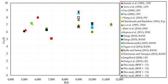 Dimensionless primary reattachment length (Lr1/h) vs. Reh in turbulent flow [1,3,30,54,55,56,57,58,59,60,61,62,63,64].