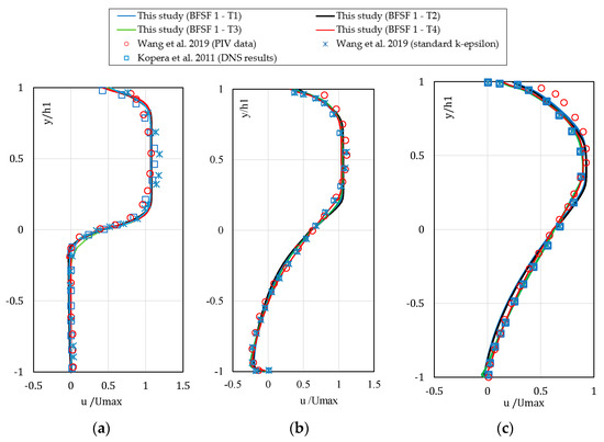 The dimensionless u-velocity distributions (u/Umax, where Umax is the maximum inlet velocity) profiles at different Reynolds numbers were compared quantitatively with available literature data. As examples, two vertical velocity profiles at Reh = 75 and 672 are presented in Figure 6 and Figure 7.