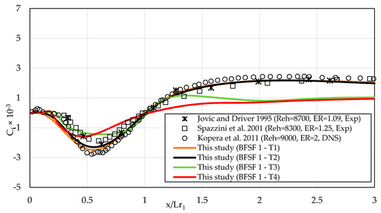 The minimum peak of the skin friction coefficient (Cf, min) was observed inside the primary recirculation zone. The average error between the numerical results of this study and the literature experimental and numerical results [19] was lower than 20% and 8.5%, respectively.