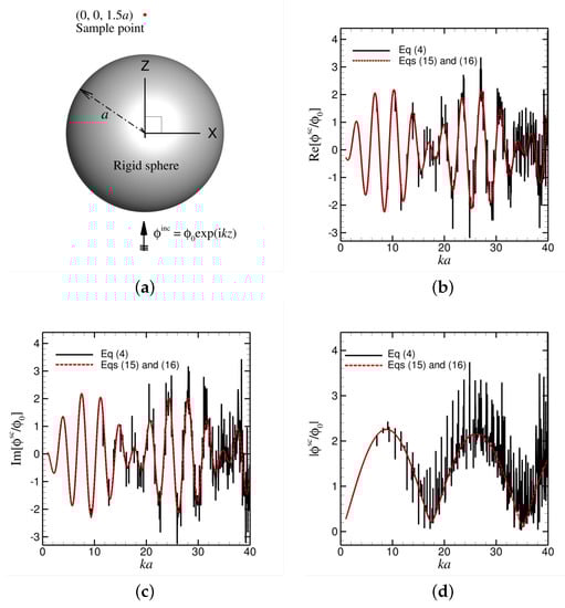 We test our framework of the non-singular Burton–Miller boundary element method given in Equations (15) and (16) via the classical example of the scattered sound wave by a rigid sphere under an incoming plane wave, as illustrated in Figure 2a. The radius of the rigid sphere is a, and its centre coincides with the origin of the coordinate system. The incoming plane wave moves along the positive z direction with wave number k and amplitude , whose potential profile can be written as . On the surface of the rigid sphere, the boundary condition is that the normal flow velocity is zero, which leads to , where is the potential of the scattered wave.