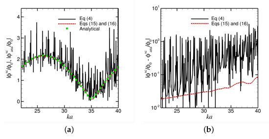 The scattered sound-wave potential, , is calculated by both the non-singular standard boundary element method, as in Equation (4), and the non-singular Burton–Miller boundary element method, as in Equations (15) and (16), with when ka spans from 1 to 40 with a step of 0.001. The rigid sphere surface is represented by 5762 nodes connected by 2880 higher-order quadratic triangular elements for all ka values.