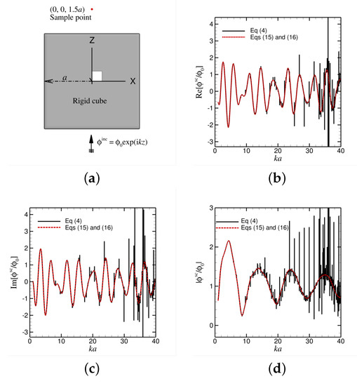 Scattering on a rigid cube with sides of length 2a used as a test case. (a) The incoming plane wave moves upwards and the observation point is behind the cube at a distance of 1.5a from the centre of the cube. (b) The results of the real part of the potential , with the non-singular Burton–Miller formulation (in red) as a function of ka. The results of the non-singular standard boundary element method are also indicated (in black). More and more spurious ‘spikes’ appear when ka becomes larger and larger. The number of nodes used is 11,642 with 5820 quadratic triangular elements. (c,d): as (b) but for the imaginary part of and the absolute value of , respectively. As in Figure 2, the desingularized Burton–Miller results (red curves) are perfectly regular for all values of ka.