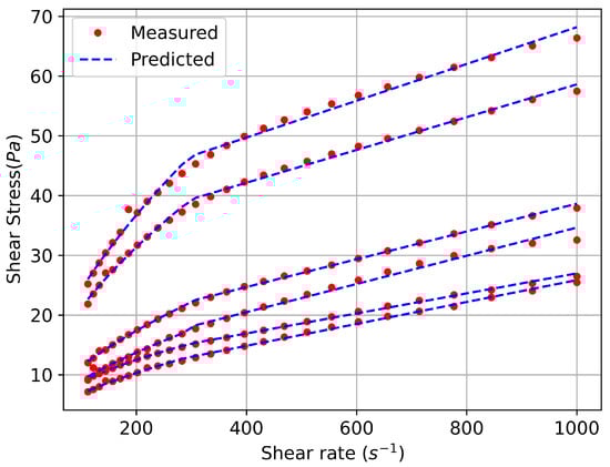 Comparison of experimental (red circles) and predicted (blue cross) values of shear stress as a function of shear rate for six phosphate slurry test samples.