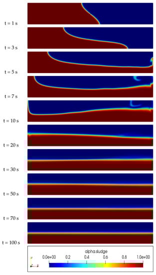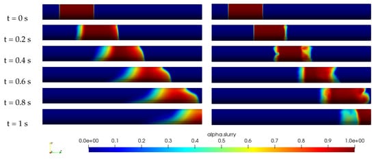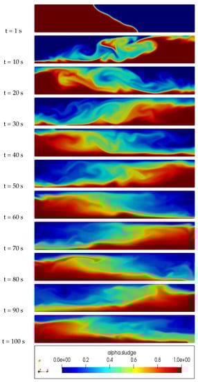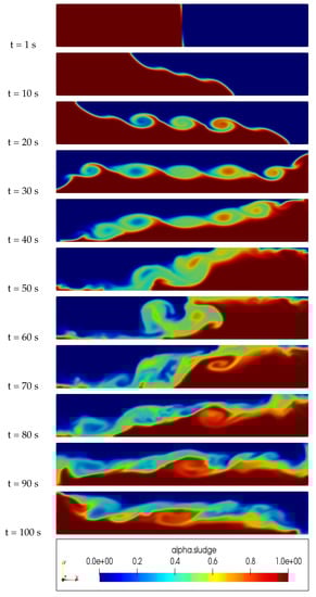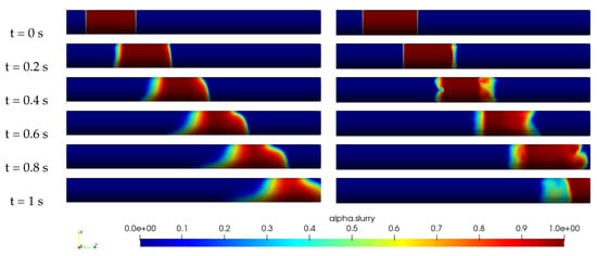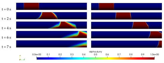 where represents the density of the slurry that corresponds to the phase fraction, while is the density that corresponds to the water phase with the phase fraction. The calculated density in the Equation (32) should not be considered as a real density of the fluid but as a density of the phase mixture that occupies a cell in the finite volume framework. The RANS model uses the density in the conservation of momentum equation. When is equal to 1, the represented phase is the slurry while the water phase is defined as 0, and vice versa. Any value between 1 and 0 describes a mixture and can also be interpreted as a percentage of the amount of this or that fluid present in a cell. The Equation (30) can be interpreted as an advection–diffusion equation for the phase.