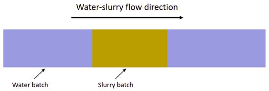 We recall that the configuration of interest in our work consists of a water-slurry batch flow, represented by Figure 6. A three-dimensional (3D) horizontal pipes are established to investigate the New rheological model of the particulate slurry flow using OpenFOAM simulations. Internal diameters cm and cm are used with corresponding pipe lengths m and m > 60 D respectively. The lengths of the slurry batch are respectively m and m. Table 4 represents physical characteristics of the two-phase system water-slurry. According to results in [29], the Herschel–Bulkley model is suitable for concentrations lower than 38.45 wt%, where the phosphate suspension rheological behavior is dilatant. The Casson model is used to model the rheological behavior of the suspension and to calculate the viscosity and yield strength for the concentration range ( to 57.27 wt%). Therefore, the new model is compared to the Herschel–Bulkley model for the concentration wt% by mass, and to the Casson model in the range of concentrations 46.03–57.27 wt%.