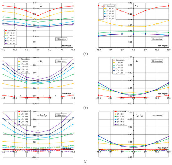 (a). Drag coefficient. (Left) 2D tapered body, (Right) 3D tapered body. (b). Lift coefficient. (Left) 2D tapered body, (Right) 3D tapered body. (c). Front/rear axle lift coefficients. (Left) 2D tapered body, (Right) 3D tapered body. Front, (open symbols, dashed lines), rear, (solid symbols and lines).