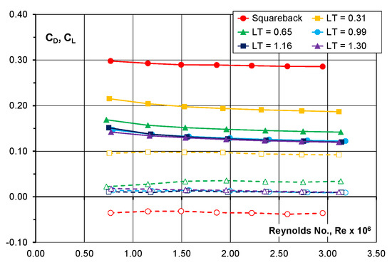 Effect of Reynolds number on drag and lift coefficients at 0° yaw. Drag coefficient, (solid symbols), lift coefficient, (open symbols).