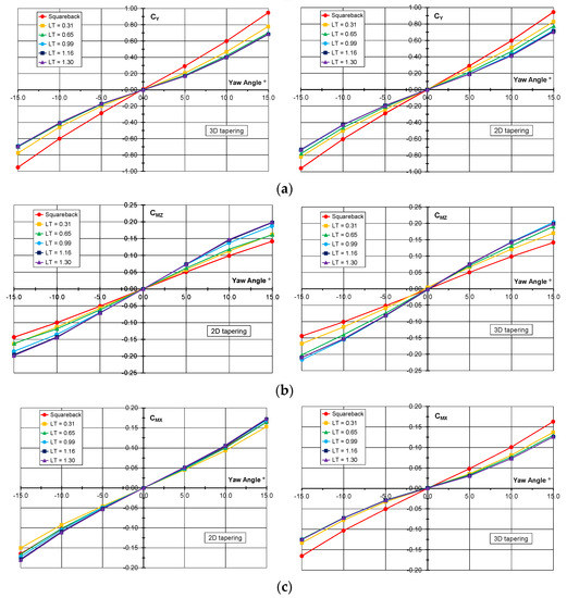 While this might be considered beneficial, the yawing moment is a more important measure of crosswind sensitivity, and this shows an opposite effect, as seen in Figure 5b. The increase in yawing moment at a given yaw angle as tail length increases occurs when the side area aft of the rear axle is increasing. This increase and the forward movement of the centre of pressure with increasing tail length in part explains why low drag bodies are sometimes associated with increased crosswind sensitivity. As with side force, the planform taper has a negligible effect.