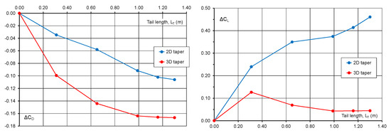 Drag coefficient reduction, (left), and lift coefficient increase, (right), from adding the tapered tail.