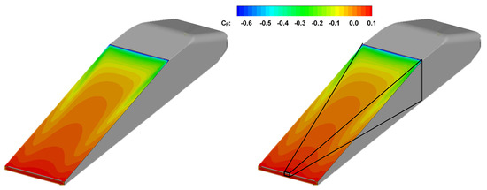 The lift and drag changes in the 2D case arise from the pressures generated on the slant and base surfaces, as shown by Howell et al. [6,7]. Figure 7, reproduced from [7], shows the pressure distribution on the slant surface of the body with a long tail. The strong suction on the side edges of the slant arise from the edge vortices. By tapering the sides of the tail as shown in Figure 7 (right), the surfaces experiencing a strong suction are removed.