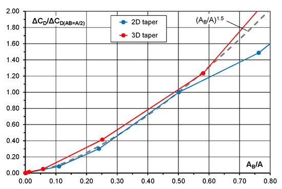 Figure 9 shows the drag increase from truncating the streamlined tails for the two cases as a ratio of the drag increase at a base area ratio of 0.5. The drag increase varies with the base area ratio to the power of 1.5. This result is in agreement with the prediction of Hoehner [8] and applies to both tapered cases with base area ratios up to 0.5. Although not shown in Figure 9, the relationship is approximately true for all the tails in the 3D case.