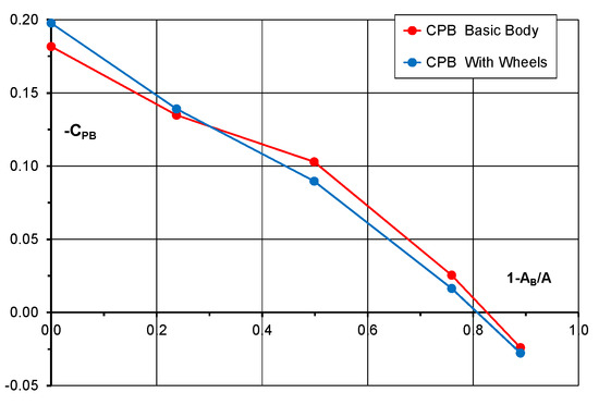 The trends are similar for both cases with the base pressure coefficient increasing markedly as the base area reduces. The base pressure coefficient becomes positive, generating a small thrust when the base area is approximately 20% of the body cross section area. The base pressure coefficients for the squareback Windsor model with and without wheels was previously measured by Varney, [12]. While for his model without wheels the base pressure coefficient was very similar, CPB = −0.177 (c.f. −0.182), the base pressure increase from adding wheels was only 4%, compared to an increase of 9%, as shown here.