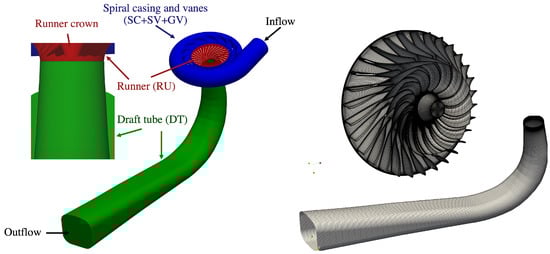As mentioned in Section 2, we use a zonal WMLES approach where the RANS and WMLES approaches are used in different regions of the domain. Since the focus of the paper is to investigate the RVR in the draft tube, we use the WMLES approach in the draft tube (region labeled by DT in Figure 1) and in the rest of the domain (regions labeled by RU, SC, SV, and GV in Figure 1), the RANS approach is employed.