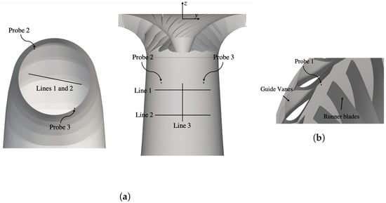 Measurement probes and lines in the experimental data provided by the second Francis-99 workshop. (a) Measurement probes and lines in the draft tube, (b) probe between guide vanes and runner.