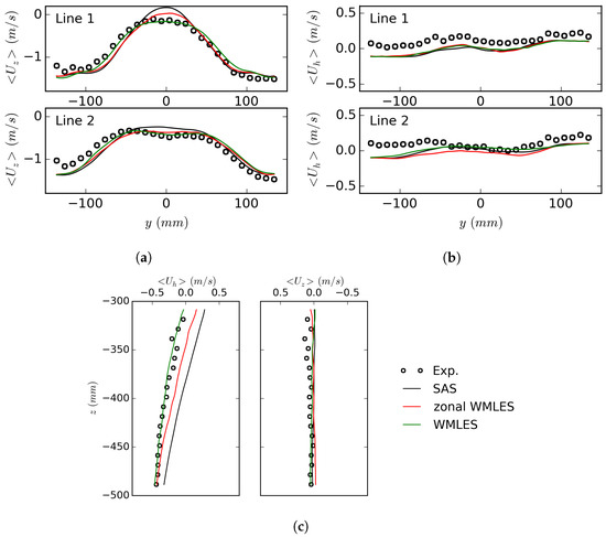 Comparison between the averaged velocities along the measurement lines in Figure 2a in the experiment [44] and the simulations. (a) Axial velocity, Lines 1 (upper) and 2 (lower). (b) Horizontal velocity, Lines 1 (upper) and 2 (lower). (c) Axial (right) and horizontal (left) velocities, Line 3.