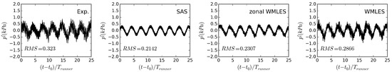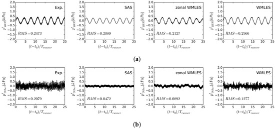 Figure 9 shows the different components of the pressure fluctuations at Probe 2 according to Equation (22) and their corresponding RMS values from the results of the simulations and experiment. For the pressure fluctuations due to the RVR, the difference between the predicted RMS values and the experimental RMS value correspond to 16%, 14% and 4% for the SAS, zonal WMLES and WMLES simulations, respectively. The reason for these differences will be explained later. The corresponding differences for the pressure fluctuations due to other sources are 77%, 59%, and 39%. The reason for these large differences is mainly that (as shown before) the numerical fluctuations do not include the synchronous pressure fluctuations with the experimental dominant frequency of shown in Figure 7a. The comparison between the results of the different simulations also shows that the RMS values of are very sensitive to the selected turbulence modeling technique. This type of pressure fluctuations includes the pressure fluctuations due to wakes of the guide vanes, runner blades, and runner crown which are captured to a larger extent in the WMLES simulation compared with the zonal WMLES and SAS simulations, for which the region upstream the draft tube is resolved using a RANS approach.