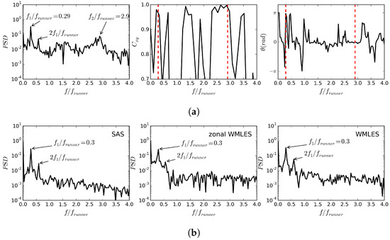 To investigate the reasons why the RMS values of the pressure fluctuations are lower in the simulations compared with the experiment, Figure 7 shows a frequency analysis of the pressure fluctuations. For the experiment, the analysis (Figure 7a) includes the power spectrum analysis of the pressure signal from Probe 2 (left plot), the coherence (middle plot), and the phase difference (right plot) between the pressure signals from Probes 2 and 3. The coherence and phase difference between the two signals are calculated from the cross-spectral density, , which is obtained using Welch’s method [46]. The frequency analysis of the experimental pressure signal (left plot) indicates the existence of two dominant frequencies, and . For these dominant frequencies, the coherence between the signals at Probes 2 and 3 (middle plot) is almost one, which means that these dominant frequencies also exist in the signal from Probe 3. The phase difference between the two signals (right plot) is for the dominant frequency and its harmonic . Considering that the locations of Probes 2 and 3 are exactly at opposite sides of the cone region in the draft tube, this phase difference suggests that the dominant frequency, , is due to the precession of the RVR in the draft tube cone. It should be mentioned that the precession frequency is in the range 0.2–0.4 , which has been found in previous studies [7,47]. For the dominant frequency , the phase difference is almost zero indicating that the corresponding pressure fluctuations are synchronous meaning that they have the same phase and amplitude for the pressure sensors located in the same cross section of the draft tube. The frequency analyses of the pressure signals in the simulations with different turbulence modeling techniques show that the dominant frequency of the RVR, , and its harmonic, , is captured by all turbulence modeling techniques. The experimental dominant frequency can however not be seen in any of the numerical results, which causes a reduced RMS value.