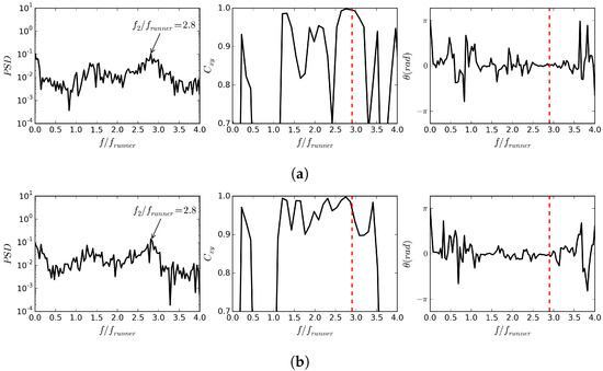 Figure 16 shows spectral analyses of the pressure fluctuations at Probe 2 for the different cavitation numbers, as well as the phase difference between the pressure fluctuations at Probes 2 and 3. The spectral analyses show that the dominant frequency, , is not affected by the presence of cavitation. As mentioned earlier, this frequency is related to the frequency of the RVR rotation. A comparison between the non-cavitating and cavitating conditions indicates that cavitation mostly affects the PSD level of the higher frequencies rather than that of the relatively low RVR frequency. For , at cavitation inception, an increase can be seen in the PSD level of frequencies larger than . By further increasing the amount of cavitation, at , the increase in the PSD level of the pressure fluctuations happens already at . At , the increase in the PSD level approaches the frequency, with a local peak at , and the PSD level of the higher frequencies again decreases. The frequency of the additional peak is the same as the dominant frequency of the vapor volume fluctuations for this cavitation number, as shown in Figure 12c. The phase difference between the pressure fluctuations at Probes 2 and 3, shown in Figure 16b, shows that for the frequencies where there is an increase in the PSD level due to cavitation, the phase difference is highly reduced (approaching zero). This means that the increased pressure fluctuations in these frequencies are synchronous.