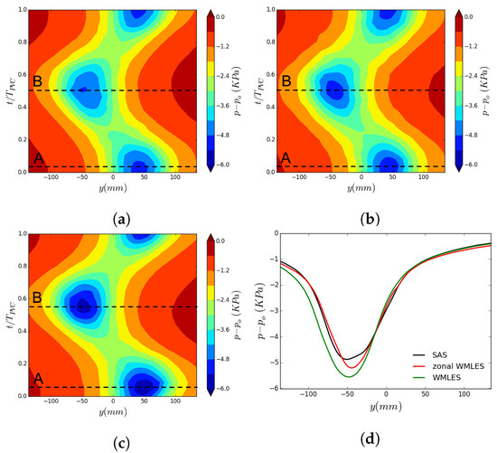 Phase-averaged pressure over Line 1 with different turbulence modeling techniques, (a) SAS, (b) zonal WMLES, (c) WMLES, (d) comparison over line at instance B. Instances A and B correspond to RVR passing Line 1.