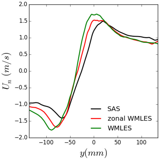 To explain the reason for the larger pressure drop in the RVR of the WMLES simulation, Figure 11 shows the phase-averaged normal velocity over Line 1 at time instance B that was shown in Figure 10. The center of the RVR approximately corresponds to due to the rotating flow around the center of the RVR. The comparison between the numerical results shows that the gradient of the normal velocity is larger around the center of the RVR in the WMLES result than with the other turbulence model techniques. This indicates that the swirling motion around the RVR in the WMLES simulation is stronger, which leads to the larger pressure drop shown in Figure 10.