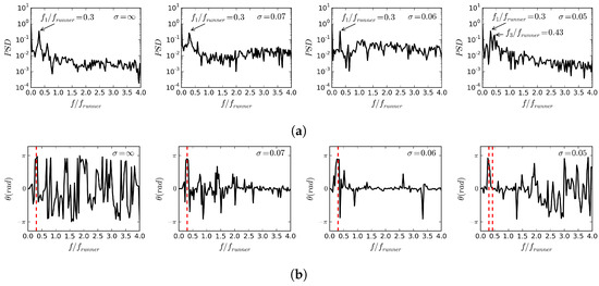 where denotes the pressure fluctuations due to the precession of the RVR and denotes the pressure fluctuations due to other sources. To perform this decomposition, we assume that the pressure fluctuations due to RVR at Probe 2 have a phase difference of with the corresponding fluctuations at Probe 3. This assumption is shown to be true in Figure 7a. Based on this assumption, the frequencies of pressure fluctuations due to RVR are determined. These frequencies are then filtered from the signal of pressure fluctuations to obtain the pressure fluctuations due to other sources, . The fluctuations due to RVR, , then can be obtained by subtracting from the original pressure fluctuation signal according to Equation (22).