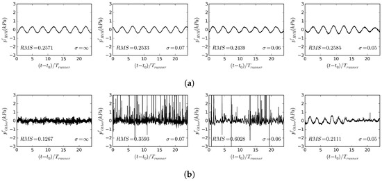 Figure 17 shows the effects of cavitation on the different components of the pressure fluctuations and their RMS values, decomposed according to Equation (22). It can be seen that the cavitation has insignificant effects on the RMS values of the pressure fluctuations due to the RVR, as the maximum difference between the RMS values for the different cavitation numbers is around 7%. However, the RMS values of the other sources are highly affected by the presence of cavitation. Similar to the trends shown in Figure 15a, the RMS of the synchronous pressure fluctuations first increases as the amount of cavitation increases ( and ), and then decreases when the RVR is fully cavitating ().