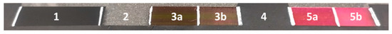 In Figure 4, you can see a graph of intensity along the sample plate. The red curve symbolizes values of light intensity obtained from the average values between the red dashed lines. Peaks with values above 45,000 are reflections of the sample plate’s dividing marks. Above the values of each sample, the average intensity value is shown in a rectangle. It can be noticed that samples 1, 2, 3a, and 5a have the lowest value of reflected light. Samples 3b, 4, and 5b have a significantly higher value.