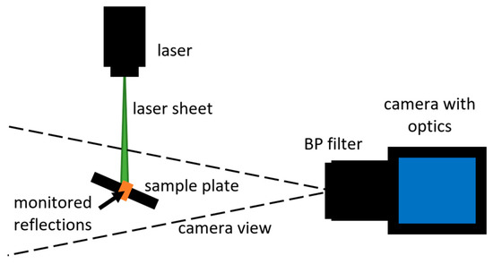 These samples were illuminated with a laser sheet, and the images of the sample plate surface were recorded using the camera with a 532 nm band-pass filter with a bandwidth of 10 nm to avoid wavelength detection outside this range. Figure 3 shows the arrangement for measuring the samples. There is a 532 nm laser that creates the laser sheet. The laser light incidences the inclined samples plate, and the light is reflected into the camera lens. The camera records the image as an intensity field.