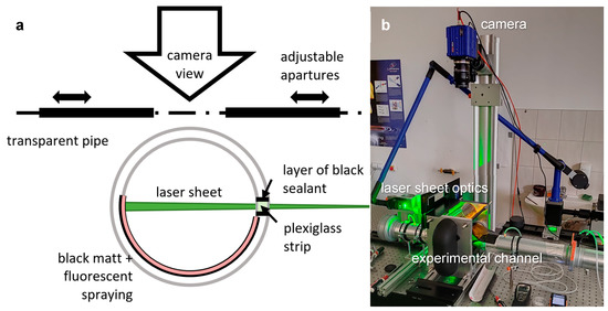 First, comparative measurements were made in a duct without geometric modifications, with only a black matt film on the inside of the duct, as seen in Figure 6. Between the camera and the laser sheet, an adjustable aperture was placed as the shield against strong reflections near the walls.