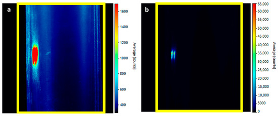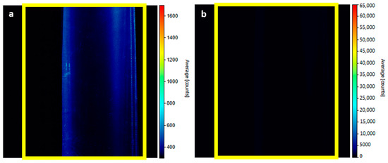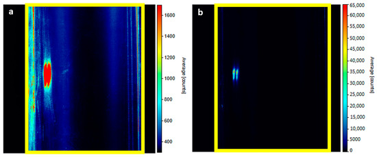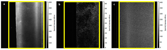 In Figure 8, you can see the intensity map of regime 0a. Yellow rectangles define the boundaries of the pipe. Figure 8a displays a range of intensities from 300 to 1700 units. Figure 8b shows the full range from 0 to the sensor maximum (65,000 counts). It is possible to notice that a small area inside the measured space attacks the maximum allowed intensity even at the lowest adjustable laser power. These two small oval reflections are probably due to the phenomenon refereed by Kong et al. [9]. Such values can only be recorded for a very short time. Otherwise, the sensor may be destroyed. Figure 9 represents regime 0b; only near-wall reflections are covered, and inside the measurement, area reflections are still there. These areas must be shielded in the current arrangement; see regime 0c in Figure 10. In this picture, both areas adjacent to the wall are covered.