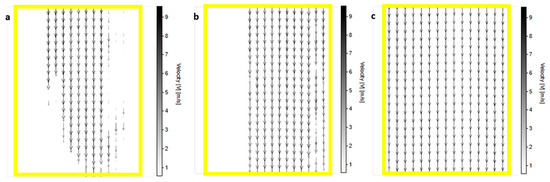 Channel streamlines for regimes 1, 2, and 3 are found in Figure 13. Every regime has a velocity greyscale of up to 9.5 m/s. They are straight and parallel, which is to be expected in this arrangement. However, in regimes 1 and 2, the edge of the shielded part of the profiles is visible on the left side. In regime 2, there are fewer degraded regions than in regime 1 due to background subtraction. Vectors in empty regions were filtered out as erroneous due to high noise. In regime 3, the channel area is completely filled with streamlines.