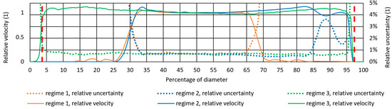 The averaged velocity profiles are plotted in the corresponding coordinates in Figure 14 to present the validity of the measured data for each mode. The horizontal primary axis represents the channel diameter in percent. The vertical axis shows the dimensionless velocity relative to the velocity in the middle of the profile. The orange line of regime 1 indicates that this mode is the least suitable as it covers the smallest part of the profile. The blue line of regime 2 is more favorable on the right side. According to the comparison of cases 1 and 2, background subtraction is necessary. However, the data on the left are not available at all due to the shielding. The best is, therefore, the green line of regime 3, i.e., with all modifications. Similar results are represented by the relative measurement uncertainty shown as a dotted line in the corresponding color; the values can be read on the secondary axis. The uncertainty in all three cases increases towards the optically degraded areas. Outside these areas, however, it is always less than 1% of the measured local value. Dataset 3 is limited only by the vertical red dashed lines that mark the calibrated area. Sections outside this area are invalid due to extreme optical distortion in the peripheral regions of the pipeline. However, this area is 7.4% of the diameter and can be further reduced using a calibration target with a finer marker grid. Still, this work mainly focuses on reducing scattered light inside the measurement space. Therefore, the relevance of the results in close proximity to the wall was not emphasized. Moreover, such a wide area may be sufficient for many potential verification measurements.