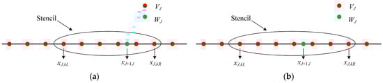 For convenience of discussion, we define two parameters to depict asymmetrical properties. We take scaling functions with N = 6 and N = 7 as examples. The stencils for the scaling functions are shown in Figure 1. The bias magnitude of the stencil is defined by the difference between the number of nodes on the left side of and that on the right side of as denoted by the BM. To evaluate the symmetry of the scaling functions, we also use symmetry factor (SF) to evaluate the symmetry of the scaling functions, which can be calculated by