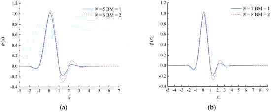 It can be observed from Equation (18) that the SF approaches to 1 as N tends to infinity, which reveals that the symmetry of the scaling function is improved as N increases. For a specified N, the SF decreases with an increment in BM. The BM and SF of the scaling functions used in the present paper for analyzing the stability and resolution of the wavelet upwind schemes are listed in Table 1. We note that the BM has the same parity with the N. The SF with the Nodd is greater than that with the Neven when the BModd and Nodd are both smaller than the BMeven and Neven by one, respectively. Here, the subscript represents the parity of the N. Some scaling functions are shown in Figure 2 as examples.