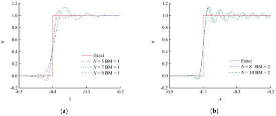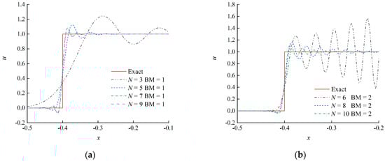 The Fourier series of the square wave is the infinite superposition of sine and cosine waves, and contains all frequency components. Numerical results at t = 8 obtained by different wavelet schemes at the resolution level J = 8 are illustrated in Figure 3. It can be seen that spurious oscillations pollute numerical solutions near the jump discontinuities for almost all schemes. Figure 3b shows that the oscillations obtained by the scheme with N = 6 are gradually amplified in the positive direction, which indicates that the scheme is unstable for discontinuity problems. For all the schemes with a specified parity of N, the length of the oscillation interval decreases with an increment in N. We continue to compute the results at t = 32, as shown in Figure 4. The results for the scheme with N = 6 are divergent for long-term time integration, which is not depicted in the figure. Although this scheme is stable for the single sine wave advection, it behaves unstably for that of the waves with multiple or infinite frequencies. It can be observed that the schemes with N ∈ odd confine spurious oscillations to the thinner region, and the amplitude of the oscillations attenuates rapidly. In addition, N = 7, BM = 3 and N = 9, BM = 3 schemes are unstable for the current problem.