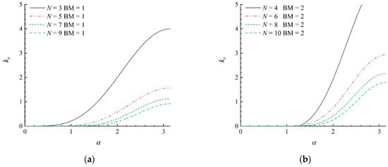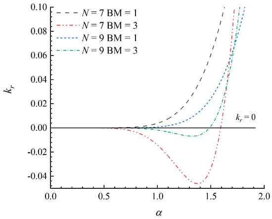 Based on the above analysis, we can conclude that only N ∈ odd schemes provide the correct implicit viscosity for solving the hyperbolic conservation laws. However, numerical tests in Section 3.1 show that the scheme with N = 7 and BM = 3 is still unstable. As has been discussed, the asymmetry of the scaling function is another factor influencing the stability of the wavelet schemes. We further evaluate the dissipation coefficients of the schemes with N = 7, BM = 3 and N = 9, BM = 3 as shown in Figure 7. It can be found that kr is negative when α is smaller than the specified value. Therefore, the schemes with BM = 3 are unstable. Now, we can achieve a basic instruction that N ∈ odd, BM = 1 schemes have non-negative dissipation coefficients and are stable for hyperbolic conservation laws.