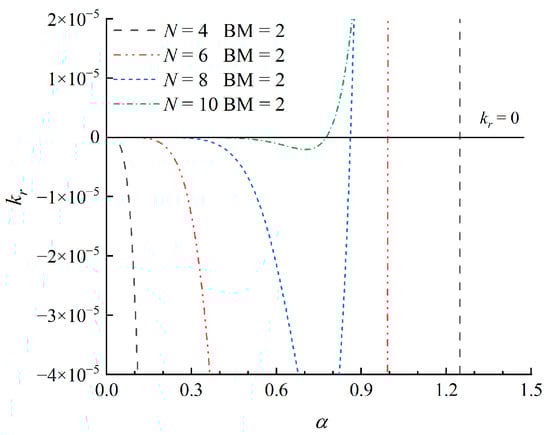 We compute the dissipation coefficient of the different wavelet schemes as shown in Figure 5. For a specified parity of N, it can be seen that kr decreases with an increase of N. The kr of the scheme with N ∈ odd is smaller than that with N ∈ even, indicating that the wavelet upwind schemes with N ∈ odd show better dissipation property. To seek the reason for the instability of several schemes, we analyze the kr for all the above schemes. We find that the negative kr exists for schemes with N ∈ even. To clarify this fact, the locally enlarged version of Figure 5b is illustrated in Figure 6. It can be observed that kr are all negative when α < 0.8. This suggests that the schemes with N ∈ even will show a negative diffusion phenomenon when J is large enough, and the error will be amplified over time. This actually induces the instability of the wavelet schemes. We also find that the local extreme value approaches to 0 as N increases for N ∈ even, which means that the negative diffusion process is weakened and the stability of the schemes is improved. This explains how the numerical tests for the schemes with N ∈ even in Section 3.1 and Section 3.2 are still stable. However, for longer time integration and some α near the local extreme value, the results might be divergent. In addition, the reason that the scheme with N = 4, BM = 2 is unstable for the sine wave evolution can also be uncovered based on the dissipation analysis. It can be observed that the scheme with N = 4, BM = 2 has the largest negative dissipation zone of the effective wavenumber α among all the candidates of the wavelet schemes caused by the severest asymmetry, leading to the instability for solving the smooth wave evolution even with far fewer nodes.