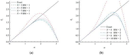 The spectral method has the optimal resolution corresponding to α = π and PPW = 2. It can be seen from Equation (28) that PPW is inversely proportional to α. The length of the interval α that ki / α is approximately equal to 1 depicts the ability of the scheme to trace the wave accurately. We choose the interval of α that satisfies and to measure the maximum α, which reflects the resolution of the schemes directly. The dispersion coefficients against α are plotted in Figure 8. It can be observed that N < 5 schemes have a large dispersion error and a low resolution. The maximum α where ki/α meets the tolerance relation increases with an increment in N for the specified parity. To clarify the resolution more clearly, we list the maximum α in the tolerance range in Table 4. It can be seen that the maximum α gradually tends to π as N increases, and the schemes with N ∈ even behave better in resolution when N > 6. On the basis of the above analysis, we can find that the wavelets are more applicable to design the high-order schemes, and the scheme with larger N has the higher accuracy and better resolution.