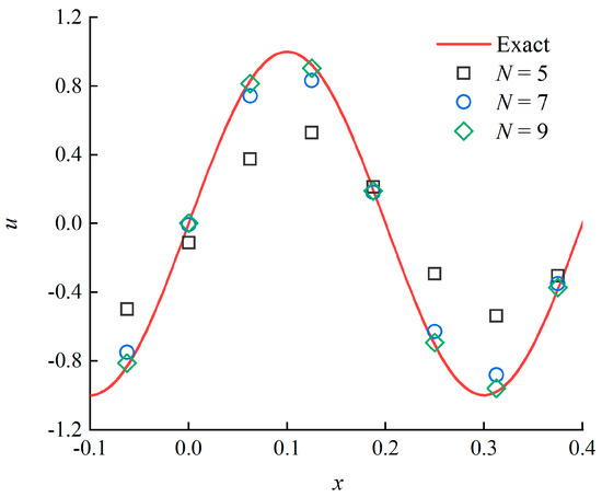 Next, we conduct a numerical test with a smooth initial distribution to verify the theoretical analysis of the dissipation and dispersion performance. The test is the advection of a sine wave described in Section 3.1 with u (x, 0) = sin (5πx) as the initial condition. The PPW is approximately equal to 6 at the resolution level J = 4. The numerical results obtained by the schemes with N ∈ odd and BM = 1 at t = 2 are shown in Figure 9. It can be seen that the higher order schemes show themselves to be less dissipative, approach the exact solution more accurately and reveal a higher resolution for the wave. Therefore, the numerical results are in accordance with the stability and resolution analysis.