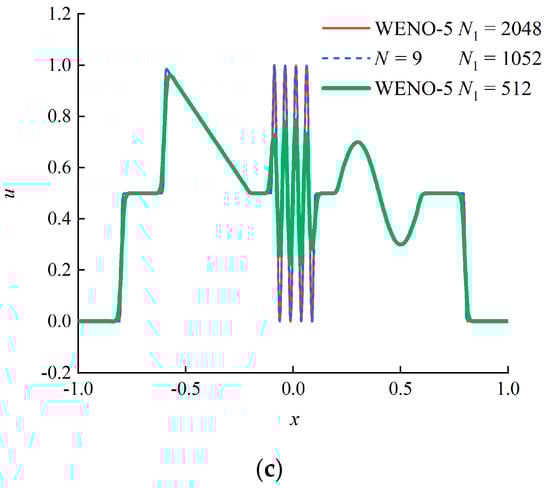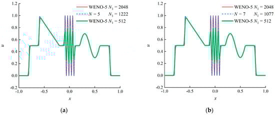 For this numerical test, we apply the adaptive wavelet upwind schemes proposed in our previous study [28]. The main idea of adaptive node generation is to recognize trouble nodes based on the wavelet coefficients that are larger than a threshold parameter ε = 10−5, and insert nodes in the adjacent zones near the trouble nodes. Moreover, an integration reconstruction method is designed based on the Lebesgue differentiation theorem to suppress the spurious oscillations. We choose the basic resolution level J0 = 6, the maximum resolution level Jmax = 12, and the same adaptive and reconstruction parameters for different schemes. The numerical results obtained by the adaptive wavelet schemes with N ∈ odd and BM = 1 at t = 2 are compared with that of the classic fifth-order finite difference WENO scheme (WENO-5) proposed by Jiang and Shu [38], as illustrated in Figure 10. It can be found that the higher order wavelet schemes can capture the discontinuities without spurious oscillations and distinguish different scale structures accurately with fewer nodes, which also verifies the better resolution of the higher order schemes. For the WENO-5 scheme, a uniform node distribution with N1 = 2048 is required to depict all the details of the solution. The nodes required in the adaptive wavelet upwind schemes are about half of the WENO-5 scheme, showing that the adaptive wavelet schemes with the integration reconstruction can capture discontinuities free from the numerical oscillations and distinguish complex solutions efficiently.