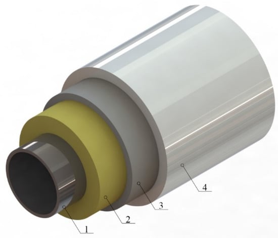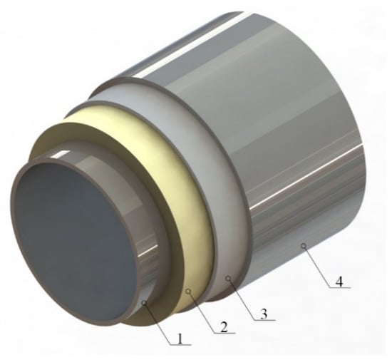 Insulating coating based on aerogel [36,38]. 1—Carrier pipe (steel ASTM 316L SS, ASTM 333 Grade 8, AISI 304); 2—A layer of insulating coating of aerogel; 3—Protective jacket pipe made of carbon steel; 4—Concrete coating.